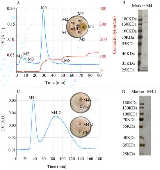 The crude protein precipitated obtained at 60% ammonium sulfate saturation was separated using a DEAE Sepharose Fast Flow chromatography column, resulting in five protein peaks, designated as M1–M5, with M4 exhibiting antimicrobial activity (Figure 8A). SDS–PAGE analysis revealed that protein peak M4 was a mixture of proteins (Figure 8B).