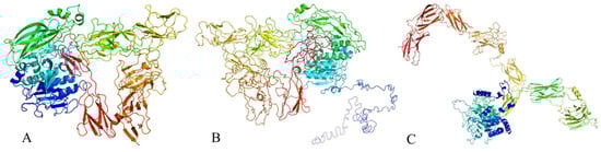 Phyre2 and I-TASSER use homology modeling, whereas trRosetta integrates deep learning technology with homologous templates for tertiary structure predictions. The accuracy of the tertiary structures predicted by different methods was compared using the TM-score value (https://zhanggroup.org/TM-score/, accessed on 18 March 2022), which assesses the topological similarity of protein structures. A TM-score between 0.5 and 1.0 typically indicates a correct topology, while a TM-score less than 0.17 suggests random structural similarity [53].