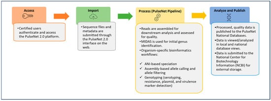 The incorporation of WGS data within the PulseNet BioNumerics v7.6 databases presented challenges that necessitated frequent updates and customizations within the software. These challenges and the need to share all bioinformatics tools as open source brought about the development of a new bioinformatics and data management system for the PulseNet USA network. In September 2024, PulseNet transitioned to a new cloud-based, modular, open-source platform, referred to as PulseNet 2.0. Data analysis within PulseNet 2.0 follows a standardized workflow that performs sequence quality assessments, the de novo assembly of sequenced genomes, speciation, sequence quality assessments, allele calling, and various genotyping tasks, such as serotyping, resistance profiling, and the identification of virulence markers and plasmids (Figure 1), using Nextflow v25.04.2 https://github.com/nextflow-io/nextflow as a workflow manager (last accessed for this study on 1 April 2025). The PulseNet 2.0 system was designed for end-to-end data analysis, making it suitable for use with WGS, a method that permits multiple characterizations of isolate genomes using one workflow [10,15,16,17].