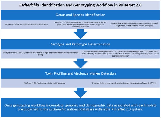 Overview of Escherichia identification and genotyping workflow in PulseNet 2.0. 1 https://cge.food.dtu.dk/services/SerotypeFinder/; 2 https://github.com/ncbi/stxtyper; 3 https://cge.food.dtu.dk/services/VirulenceFinder/. All websites were last accessed on 1 April 2025 for this study.