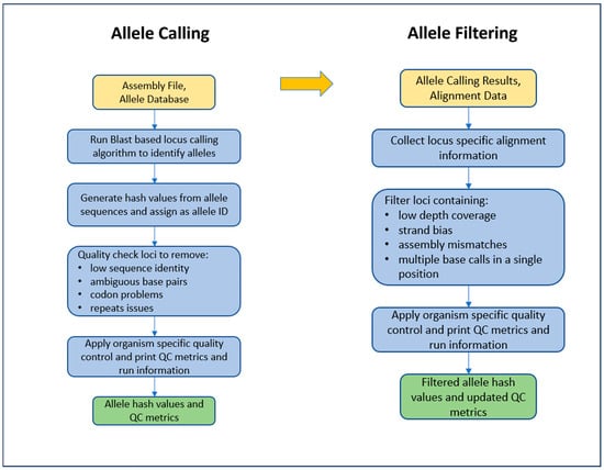 WGS Analysis and Allele Calling. Illumina sequence read files for all isolates were linked and analyzed in the PulseNet 2.0 system. Genus identification was performed using MIDAS (v1.3.2) [19]. The raw reads were trimmed with fastp https://github.com/OpenGene/fastp (v0.32.2), last accessed for this study on 1 April 2025), using an average quality threshold of 30 and downsampled to 100× coverage with seqtk https://github.com/lh3/seqtk/releases (v1.3), last accessed for this study on 1 April 2025, using an expected genome size of 4.2 Mb. MIDAS (v1.3.2) was run a second time using the cleaned reads to detect any contamination. De novo assembly of the cleaned reads was performed with SPAdes (v3.15.5) [34] using the—isolate option. The cleaned reads were aligned back to the assembled genomes using BWA (Burrow–Wheeler Aligner) https://github.com/lh3/bwa (v0.7.17), last accessed for this study on 1 April 2025. The assembly was corrected by removing any contigs shorter than 500 bp, those with an average read depth below either a threshold of 15× or 25% of the assembly average depth, whichever value was greater, and those with a GC content less than 5%, as measured based on Samtools https://github.com/samtools (v1.16.1), last accessed for this study on 1 April 2025. The cleaned reads were mapped back to the corrected assembly to create cleaned BAM—Binary Alignment Map—files. The genus and species were identified using ANI with MUMmer https://github.com/chienchi/MUMmer (v3.23), last accessed for this study on 1 April 2025, and the genus result was verified with the MIDAS result. Sequences determined by ANI to be E. coli (including Shigella spp.) were retained for further analysis. Allele calls were generated using the PulseNet 2.0 MLST caller with the following steps: the corrected assemblies were compared against reference allele sequences in the PulseNet 2.0 MLST database repository https://github.com/ncezid-biome/pn2.0-mlst-databases (schema further described below under the heading “PulseNet 2.0 Escherichia Allele Schema”) using a BLASTn https://ncbiinsights.ncbi.nlm.nih.gov/2021/07/09/blast-2-12-0/ (v2.12), last accessed for this study on 1 April 2025), approach to find the presence of each locus. The query allele sequence was defined by the presence of start and stop codons (without nonsense mutations) and a minimum similarity of 85% against a reference allele. Loci that were likely repeated (fully or partially) elsewhere in the genome were ignored. The query sequences were hashed using the 64-bit MD5 algorithm and then transformed into a 56-bit integer https://github.com/ncezid-biome/pn2.0-mlst-databases?tab=readme-ov-file#hashing-function, last accessed for this study on 1 April 2025. A further filtration was performed using the aligned reads, and alleles that did not meet these minimum quality standards for each nucleotide call were removed: 65% homozygosity rate, depth of coverage greater than 5× depth, at least 1% of reads supporting each forward and reverse strand (Figure 3).