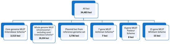 PulseNet 2.0 Escherichia schema. Number of loci included within schemes are shown for the overall scheme (all loci), core genome, whole genome (excluding core), plasmid, and 7-gene, 8-gene, and 15-gene MLST schemes. * indicates that the scheme is hosted on Enterobase: https://enterobase.warwick.ac.uk/ (last accessed for this study on 1 April 2025).