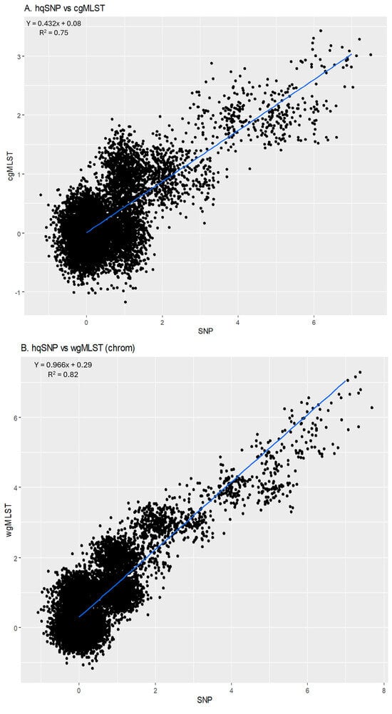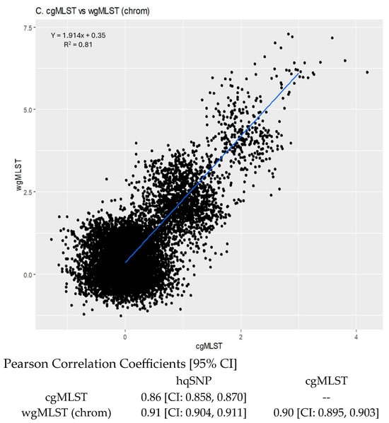 For cgMLST vs. wgMLST (chrom), the slope of the linear regression was 1.914 [95% CI: 1.895, 1.933]; (R2 = 0.81), indicating that there were higher wgMLST (chrom) allele differences per cgMLST allele difference, as expected, since wgMLST incorporates more loci than cgMLST. The y-intercept was 0.35, illustrating that sequences that were zero cgMLST alleles different were less than 1 wgMLST (chrom) allele different (Figure 5C).