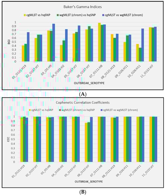 Tanglegrams (side-by-side facing dendrograms) were constructed to compare the phylogenies generated using each subtyping method [(cgMLST, wgMLST (chrom), and hqSNP)] when outbreak isolate sequences were combined with their corresponding sporadic/non-outbreak isolate sequences. Allele-based dendrograms were constructed in the PulseNet 2.0 system using absolute allelic differences. SNP-based dendrograms were constructed using the maximum likelihood method [40]. All allele and SNP-based dendrograms were converted to Newick format and assembled into tanglegrams in Base R v4.1.2 (dendextend package) [41], last accessed for this study on 01 November 2024, and the layout was optimized to minimize entanglement, as intricately tangled trees can become difficult to analyze, using the step2side method [42]. The statistical association of the branches in the two facing dendrograms was assessed using two measures: the Baker’s Gamma Index (BGI) and Cophenetic Correlation Coefficient (CCC). The Baker’s Gamma Index, also known as the Goodman–Kruskal–gamma index, is a statistical measure of the similarity between two hierarchical clustering trees and ranges from −1 to 1, with values closer to 1 indicating greater statistical similarity [43]. A value near 0 indicates that the trees are not statistically similar, and a negative value suggests strong disagreement between the dendrograms. The Cophenetic Correlation Coefficient is a statistical measurement that evaluates how well a dendrogram preserves the original distances between data points and is particularly useful for understanding clustering quality. A coefficient close to 1 indicates that the clustering algorithm preserves the original data structure well, while a lower coefficient suggests the clustering less accurately represents the distances [44]. Both measures were acquired using the dendextend package in Base R v4.1.2 [41].