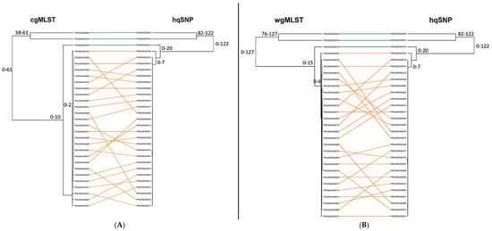 (A) Tanglegram of cgMLST and hqSNP clustering using single linkage for one representative outbreak (outbreak 04) and its corresponding sporadic/non-outbreak isolates. (B) Tanglegram of wgMLST (chrom) and hqSNP clustering for the same set of isolate sequences. Outbreak isolates are depicted in orange, and sporadic isolates are depicted in green. The tanglegram links tips with the same label to each other via a straight line. Allele/hqSNP differences are labeled at each node.