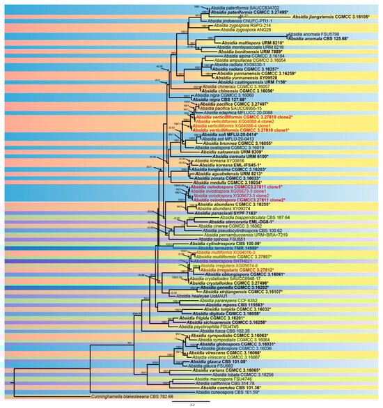 The sequence matrix included 87 strains in 64 species of Absidia, with Cunninghamella blakesleeana CBS 782.68 as an outgroup. A total of 4656 characters comprised ITS rDNA (1–975), SSU rDNA (976–2017), LSU rDNA (2018–3030), Act (3031–3689), and TEF1α (3690–4656). As many as 2737 characters were constant, while 706 and 1213 among the variable characters were parsimony-uninformative and informative, respectively (Supplementary File S1). MrModelTest suggested that the Dirichlet fundamental frequency and GTR-I-G evolution pattern for all partitions were adopted in Bayesian inference. The topology of the Bayesian tree, consistent with that of the ML tree, was used as a representative to summarise the evolutionary history within the genus Absidia (Figure 1), exhibiting the phylogenetic placement of the four new species. A. irregularis is related to A. oblongispora with full supports (MLBV = 100, BIPP = 1.00), and A. ovoidrospora is closely related to A. panacisoli and A. abundans with full supports (MLBV = 100, BIPP = 1.00). A. multiformis is most closely related to A. heterospora with high supports (BIPP = 0.99), and A. verticilliformis is closely related to A. edaphica with robust supports (MLBV = 94, BIPP = 1).