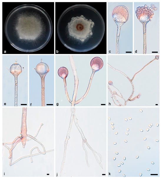 Absidia verticilliformis ex-holotype CGMCC 3.27810. (a,b) Colonies on PDA ((a) obverse; (b) reverse); (c–e) an unbranched sporangiophore with a sporangium; (f) columellae, collars, sporangiospores, and apophyses; (g,h) branched sporangiophores with columellae, collars, sporangiospores, and apophyses; (i,j) rhizoids; (k) sporangiospores; bars: (c–k) 10 μm.