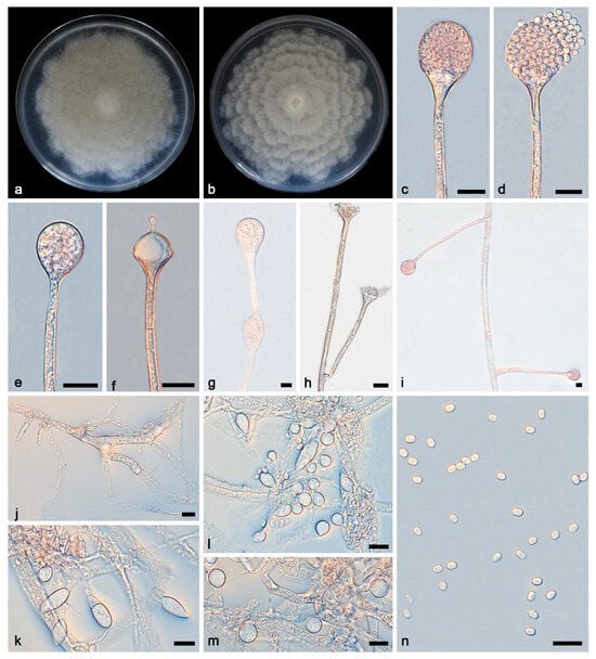 Absidia ovoidospora ex-holotype CGMCC 3.27811. (a,b) Colonies on PDA ((a) obverse; (b) reverse); (c–e) an unbranched sporangiophore with a sporangium; (f) columellae, collars, sporangiospores, and apophyses; (g) unbranched sporangiophores with swelling and sporangium; (h) branched sporangiophores with columellae, collars, and apophyses; (i) branched sporangiophores with sporangia; (j) rhizoids; (k–m) giant cells; (n) sporangiospores; bars: (c–n) 10 μm.