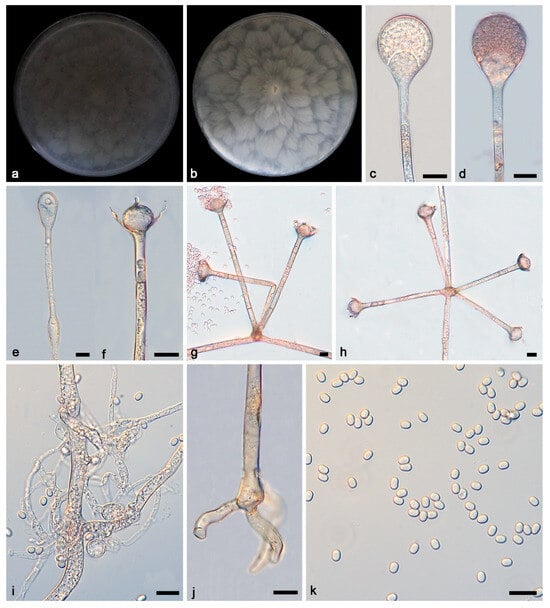 Absidia irregularis ex-holotype CGMCC 3.27812. (a,b) Colonies on PDA ((a) obverse; (b) reverse); (c,d) an unbranched sporangiophore with a sporangium; (e,f) columellae, collars, sporangiospores, and apophyses; (g) branched sporangiophores with sporangia; (h) branched sporangiophores with columellae, collars, sporangia, and apophyses; (i,j) rhizoids; (k) sporangiospores; bars: (c–k) 10 μm.