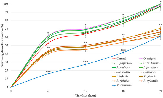 Swimming diameter of Aliivibrio fischeri after treatment with or without (control) essential oils during four time laps. EO data are mean values (±SD) of at least four independent measurements (n = 3); different (*), (**) and (***) indicate significant differences during each time lap (p < 0.001).