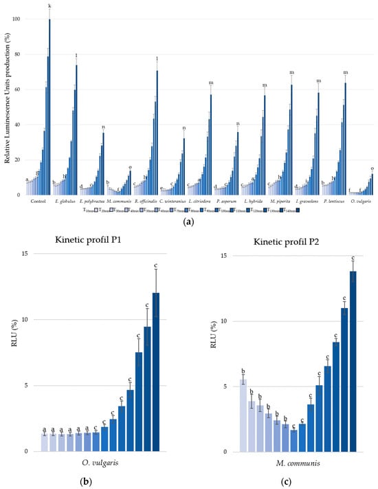 Bioluminescence production of Aliivibrio fischeri after treatment with essential oils or without (control). Data are mean values (±SD) of at least four independent measurements (n ≥ 4); different lowercase letters indicate significant differences between each EO at three points during the kinetic cycles (1, 7, and 14) (p < 0.001) (a). Kinetic profiles in bioluminescence inhibition with O. vulgaris (b) and M. communis (c) EOs. Data are mean values (±SD) of at least four independent measurements (n ≥ 4) different lowercase letters indicate significant differences between the two EOs at each kinetic cycle (p < 0.001).