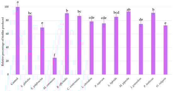 Relative percentages of Aliivibrio fischeri biofilm production in the absence (control) or presence of EOs. Data are mean values (±SD) of at least four independent measurements (n ≥ 4) different lowercase letters indicate significant differences between each EO (p < 0.001).