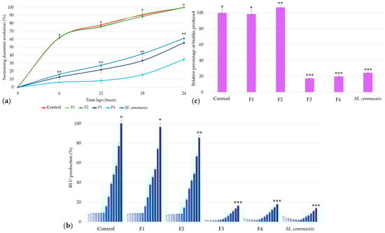 In contrast to M. communis fractions F1 and F2 (G1), the use of 25 ppm of F3 and F4 (G2) against A. fischeri resulted in a significant reduction in swimming motility, respectively, 44.31% (±4.75%) and 65.10% (±3.40%) (Figure 4a).