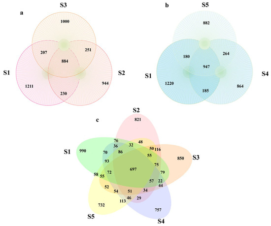 Transmission electron microscopy (TEM) is an effective technique for analyzing the minuscule crystalline internal structure and shape of nanoparticles via electron diffraction. The typical morphology of Cu-Ag nanoparticles is spherical, as shown by micrographs that reveal a narrow size distribution and smooth surfaces (Figure S1). The tomato plants were photographed and measured before sampling. No significant differences were observed in the height of tomato plants between the treatment and control groups, showing that the application of nanomaterials did not influence tomato height (Figure S2). High-throughput sequence analyses were conducted to assess the effects of thiodiazole–copper and Cu-Ag nanoparticle application on tomato rhizosphere microbial communities. Following the removal of chloroplast DNA, mitochondrial DNA, and other non-bacterial sequences, along with conducting quality control, a total of 57,139–64,372 clean tags were isolated. Then, chimeras were removed from the tags, resulting in 53,373–61,838 valid tags, which were subsequently utilized for analysis. These sequences were assigned to a range of 981–1185 amplicon sequence variants (ASVs). The resulting ASVs were subjected to comprehensive analysis to ascertain treatment-specific responses to exogenous material in the tomato rhizosphere. Exposure to varying concentrations of Cu-Ag nanoparticles and thiodiazole–copper impacted the number of bacterial ASVs in the tomato rhizosphere. A total of 2532, 2309, 2342, 2260, and 2273 ASVs were observed in groups S1, S2, S3, S4, and S5, respectively. More ASVs were discovered in the Cu-Ag nanoparticle treatment than in the thiodiazole–copper group. An examination of samples treated with low and high dosages of Cu-Ag nanoparticles and control samples revealed a total of 884 unique ASVs. A comparison of the thiodiazole–copper and control tomato sample datasets revealed that 947 ASVs were shared. Of the total microbial ASVs, 697 were shared by all five treatments (Figure 1).