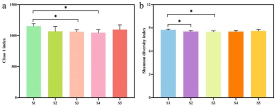 Chao1 (a) and Shannon (b) index of tomato under the exposure of low and high dosages of thiodiazole–copper and Cu-Ag nanoparticles nanomaterials. Error bars showing the mean of four replicates. Statistical significance was determined based on Tukey’s HSD test. * p < 0.05.