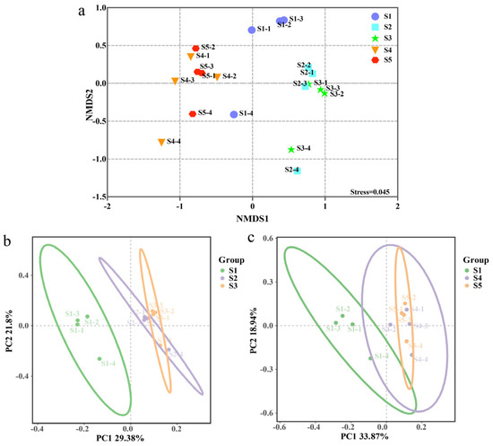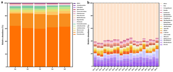 The bacterial community at the class level was primarily composed of Alphaproteobacteria, Gammaproteobacteria, and Bacteroidia, followed by representatives from Polyangia, Acidobacteriae, Gemmatimonadetes, and Actinobacteria. The cumulative percentages of these bacteria were 93.60%, 94.73%, 94.02%, 94.73%, and 95.13% in the S1, S2, S3, S4, and S5 groups, respectively (Figure S4).