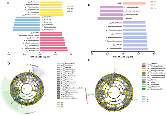 The linear discriminant analysis effect size (LEfSe) can identify biomarkers with significant variations. Linear discrimination analysis (LDA) scores >3.5 were used to reveal the biomarkers with the largest differences in tomato rhizosphere soil microbial communities under different treatment conditions. Alterations in bacterial taxonomic abundance in soil were induced by both low and high concentrations of the nano-bactericide. Tomato plants treated with a low dose of the nano-bactericide were enriched in the genus Chujaibacter (3.77), the genus UTBCD1 (3.96), the class Bacteroidia (4.12), the phylum Bacteroidota (4.13), the family Chitinophagaceae (4.28), and the order Chitinophagales (4.29). In the rhizosphere of healthy tomato plants treated with a higher dose of the nano-bactericide, the following kinds of bacteria were found: the genus Terrimonas (3.81), the family Flavobacteriaceae (3.77), the genus Flavobacterium (3.68), the genus Ferruginibacter (3.62), the genus Luteimonas (3.59), and the family Xanthomonadaceae (3.57) (Figure 5a,b). Differential alterations were seen in the microbial communities of tomato rhizosphere soil after bactericide treatment. Only the genus Afipia (3.62) was abundant in soils treated with a low level of thiodiazole–copper. Four biomarkers were discovered in soil treated with a high concentration of thiodiazole–copper: the genus Devosia (4.03), the genus Mucilaginibacter (3.68), the family Sphingobacteriaceae (3.65), and the family Sphingobacteriales (3.64), all of which displayed significant abundance (Figure 5c,d). The LEfSe analysis indicated variations in microbial community biomarkers between tomatoes treated with the nano-bactericide and those treated with the bactericide.