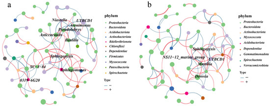 The bacterial community networks in the tomato treated with nano-bactericide (a). The community networks in the tomato treated thiodiazole–copper (b). The number of nodes, edges, and the clustering coefficients are shown in the networks, and the nodes are colored according to phylum. Pink and blue lines represent negative and positive associations, respectively.