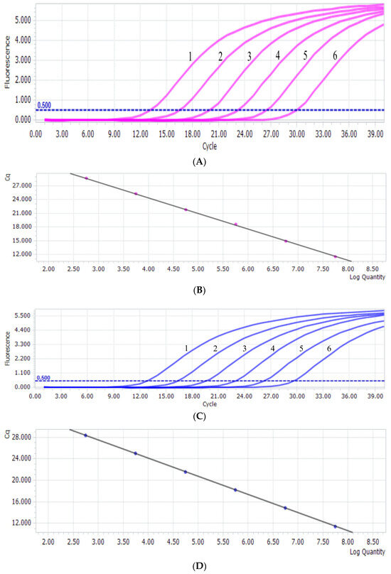 The results revealed that T-PiAdV-1 had a linear relationship in the reaction from 5.7 × 102 to 5.7 × 107 copies/μL (Figure 1A). The standard curve regression equation was y = −3.4263x + 38.08, and the correlation coefficient R2 was 1.00 (Figure 1B). The linearity of T-PiAdV-2 was good using the dilution range from 5.6 × 102 to 5.6 × 107 copies/μL (Figure 1C). The standard curve regression equation was y = −3.4037x + 37.71, and the correlation coefficient R2 was 1.00 (Figure 1D).