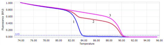 Melting profiles of the qPCR-HRM assay. 1: PiAdV-2; 2: mixed infection with PiAdV-1 and PiAdV-2; 3: PiAdV-1.
