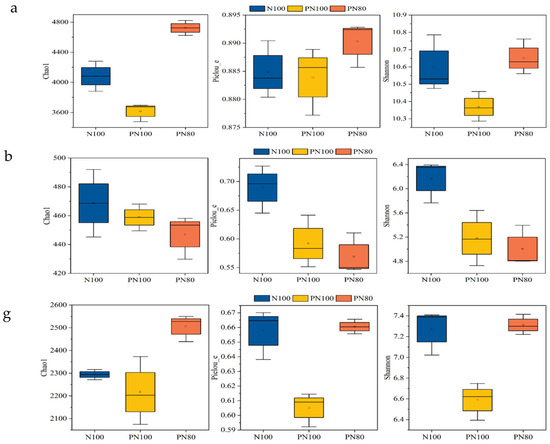 The application of PPM had different effects on the Chao 1 index of soil biocommunities of different treatments (p < 0.05) (Figure 1a). The Chao 1 index of soil bacterial and nematode communities of the PN80 treatment was 30.6% and 10.7% greater than that of the N100 treatment, respectively (p < 0.05) (Figure 1a,g). However, there was no difference in the Chao 1 index of soil fungal community between the treatments (p > 0.05) (Figure 1b). The application of PPM also had different effects on the Shannon 1 index of soil bacterial and nematode communities of different treatments. The Shannon index of soil bacterial and nematode communities of the PN80 treatment was 2.72% and 3.17% greater than that of the N100 treatment, respectively (p < 0.05) (Figure 1a,g). The combined application of PPM and nitrogen fertilizer significantly impacted the Pielou and Shannon indexes. The Pielou and Shannon indexes of the PN100 treatment were 21.1% and 23.3% smaller than those of the N100 treatment, respectively (p < 0.05), and the Pielou and Shannon indexes of the PN80 treatment were 17.4% and 18.9% smaller than those of the N100 treatment, respectively (p < 0.05) (Figure 1b).