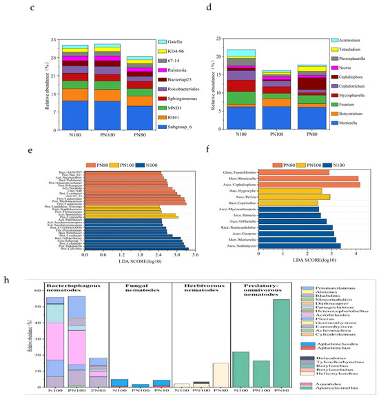LEfSe differential analysis (LDA Effect Size) was conducted to further compare the key bacteria that have significant roles in different treatments. The PN80 treatment had the most complex microbial community changes. A total of 30 key bacterial genera were identified in the three treatments (Figure 1e). LEfSe analysis found that the PN100 and PN80 treatments had more soil bacteria and fungi than the N100 treatment (p < 0.05). In the N100 treatment, Cellvibrio, Dokdonella, Lysobacter, Pseudomonas, EV818SWSAP88 (Proteobacteria), Adhaeribacter, Pontibacter (Bacteroidetes), Saccharomonospora, Patulibacter (Actinobacteria), and Subgroup_7 (Acidobacteria) had a larger LDA value compared with other bacterial genera. In the PN100 treatment, Legionella, Thermomonas, Candidatus_Nitrotoga (Proteobacteria), Staphylococcus (Firmicutes), and Sporichthya (Actinobacteria) had a larger LDA value. In the PN80 treatment, Phyllobacterium, Lysobacter, Polyangium, Anaeromyxobacter, Neo_b11 (Proteobacteria), Lactococcus (Firmicutes), A4b (Chloroflexi), Pedobacter, AKYH767 (Bacteroidetes), 67_14, Nocardia, and Saccharothrix (Actinobacteria) had a larger LDA value. To determine the key fungi significantly affected by the treatments, LefSe analysis was further conducted, revealing a total of 13 key fungal genera in the treatments (Figure 1f). In the N100 treatment, Sodiomyces, Geopora, Gibberella, Bimuria, Mycocentrospora (Ascomycota), Coprinellus (Basidiomycota), Ramicandelaber (Kickxellomycota), and Mortierella (Mortierellomycota) had a larger LDA value compared with other fungal genera. In the PN100 treatment, Peziza (Ascomycota) and Hygrocybe (Basidiomycota) had a larger LDA value. In the PN80 treatment, Cephaliophora (Ascomycota), Funneliformis (Glomeromycota), and Mortierella (Mortierellomycota) had a larger LDA value. Therefore, the soil microbial community structures of the PN100 and PN80 treatments were generally similar, but there were some differences in the relative abundance of the microbial communities (Figure 1f).
