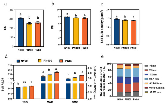 The application of PPM significantly affected the particle size distribution of soil aggregates (Figure 2e) and significantly reduced soil bulk density (Figure 2c). The contents of soil aggregates with a particle size small than 0.053 mm and in the ranges of 0.053–0.25 mm and 0.5–1.0 mm of the PN80 and PN100 treatments were 35.9–76.5%, 12.2–14.0%, and 6.93%–11.4% higher than those of the N100 treatment, respectively (p < 0.05). In addition, the content of soil aggregates with a particle size greater than 0.25 mm (R0.25), geometric mean diameter (GMD), and mean weight diameter (MWD) of the PN80 treatment were 5.10%, 6.78%, and 8.91% higher than those of the N100 treatment, respectively, and the R0.25, GMD, and MWD of the PN100 treatment were 7.15%, 11.4%, and 11.1% higher than those of the N100 treatment, respectively (p < 0.05, Figure 2d). In addition, the soil bulk density of the PN100 and PN80 treatments was 0.06 and 0.02 g·cm−3 lower than that of the N100 treatment (p < 0.05, Figure 2c). The application of PPM had significant effects on soil physicochemical properties, i.e., soil EC and pH. The soil pH of the PN100 and PN80 treatments was 0.31 and 0.36 lower than that of the N100 treatment, respectively (p < 0.05, Figure 2a), and the soil EC was 18.2% and 15.5% lower than that of the N100 treatment, respectively (p < 0.05, Figure 2b).