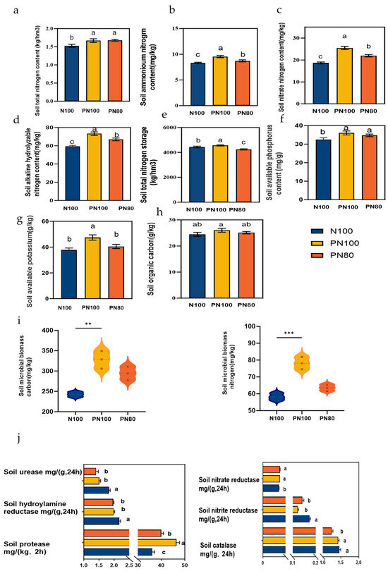 The soil TN, ammonium nitrogen, nitrate nitrogen, ANS, and AK contents of the PN100 treatment were 10.3%, 14.5%, 36.7%, 23.3%, and 21.7% higher than those of the N100 treatment, respectively (p < 0.05). The soil TN, ammonium nitrogen, nitrate nitrogen, ANS, and AK contents of the PN80 treatment were 9.03%, 4.71%, 17.8%, 12.8%, and 8.77% higher than those of the N100 treatment, respectively (p < 0.05). Moreover, the SOC, MBC, and MBN contents of the PN80 and PN100 treatments were higher than those of the N100 treatment, and the SOC, MBC, and MBN contents of the PN100 treatment were 6.36%, 35.2%, and 34.1% higher than those of the N100 treatment, respectively (p < 0.05) (Figure 3a–i).