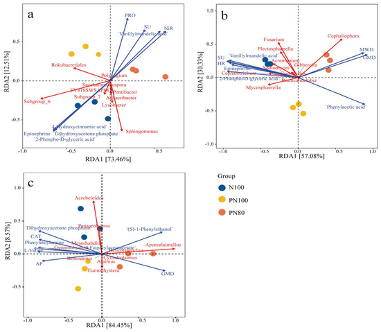 RDA results showed that RDA1 and RDA2 axes explained 73.5% and 12.5% of the total variations in the bacterial community, respectively (Figure 4a). The RDA1 axis separated N100 and PN100 treatments from PN80 treatment, while the RDA2 axis separated N100 treatment from polymer treatments (PN100, PN80). Meanwhile, PN80 treatment had a significantly positive correlation with the activities of soil protease, urease, and nitrite reductase. The PN100 treatment mainly significantly impacted Rokubacteriales. Among soil environmental factors, the activities of soil protease (PRO), urease (SU), and nitrite reductase (NiR) had the greatest impact on the bacterial community structure. The abundances of bacteria Rokubacteriales, Subgroup-6, and Sphingomonas were significantly negatively correlated with the activity of PRO, SU, and NiR, while the abundance of Rokubacteriales was positively correlated with PRO activity.