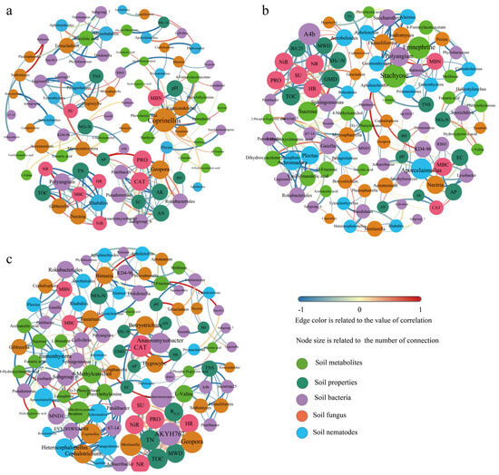Due to the complex responses of bacterial, fungal, and nematode communities for different treatments, the relationships of soil properties, key microorganisms, and nematode groups, and interactions between metabolites can be indicated by the symbiotic network analysis under different treatments (Figure 6). The PN100 and PN80 treatments had more nodes and edges in the network compared with the N100 treatment, indicating that the PN100 and PN80 treatments had a more complex network. Moreover, the network of the PN80 treatment was more complex than that of the PN100 treatment.