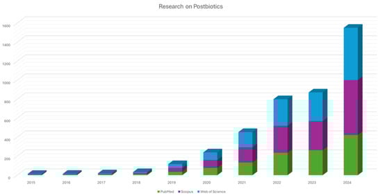 Trends of scientific publications on postbiotics over the last decade (2015–2024), based on data extracted from PubMed, Scopus, and Web of Science. The figure reflects the increasing number of studies focused on postbiotics, highlighting the growing interest and recognition of their therapeutic potential, especially in areas such as gut health, inflammation, and cancer.