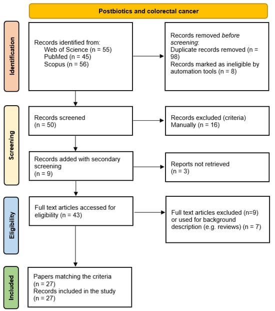 In this section, the selection of the studies to be analyzed was carried out using the methodologies of an extensive literature search (ELS) and the principles of the PRISMA (The Preferred Reporting Items for Systematic reviews and Meta-Analyses) guidelines, 2020 version [128,129,130]. The initial searches were performed in three databases: PubMed, Scopus, and Web of Science. All keywords and terms were selected using the MeSH (Medical Subject Headings) vocabulary. The primary strings included “postbiotic AND colorectal cancer”, “postbiotic AND colorectal cancer OR tumor”, followed by secondary keywords in order to retrieve all studies, such as “butyrate”, “p40”, “p70”, “cell free supernatant”, “Lactobacillus”, “bacteriocins”, “exopolysaccharide”, “colon organoids”.