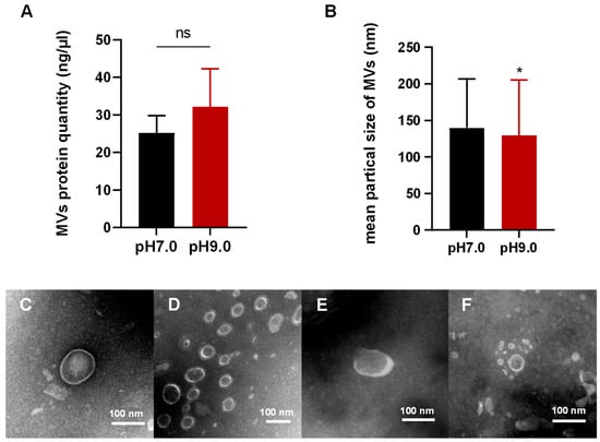 (A) BCA protein quantification analysis showed that the alkaline environment pH 9.0 did not alter the production of E. faecalis MVs. (B) The average particle size of MVs isolated at different pH conditions was examined by NTA, which showed that E. faecalis produces smaller sized vesicles in alkaline environment. n = 3. The experiment was repeated three times; * p < 0.05, ns: non-significant. (C–F) TEM investigation of MVs isolated at different pH conditions. (C) MVs isolated at pH 7.0, magnification ×40.0 K times. (D) MVs isolated at pH 7.0, magnification ×30.0 K times. (E,F) MVs isolated at pH 9.0, magnification ×40.0 K times.