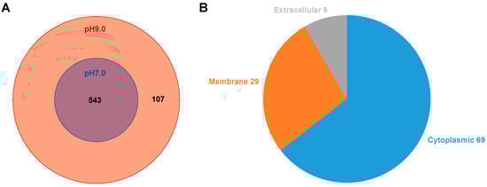 (A) Venn diagram of MVs proteins at different pH conditions. (B) Subcellular structural localization of E. faecalis MVs proteins in alkaline environment by CELLO.