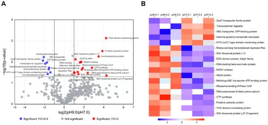 (A) Volcano plot of potential differences between MVs isolated at different pH conditions. The red dots represent proteins up-regulated in pH 9.0 MVs, and the blue dots represent proteins down-regulated, and grey represents proteins with no significant difference in expression between pH 7.0 and pH 9.0 environment. (B) Cluster analysis heatmap. Each column represents a set of samples (horizontal coordinates are sample information) and each row represents a protein (vertical coordinates are significantly different proteins), where red represents significantly up-regulated proteins, blue represents significantly down-regulated proteins, and white sections represent no protein quantification information.