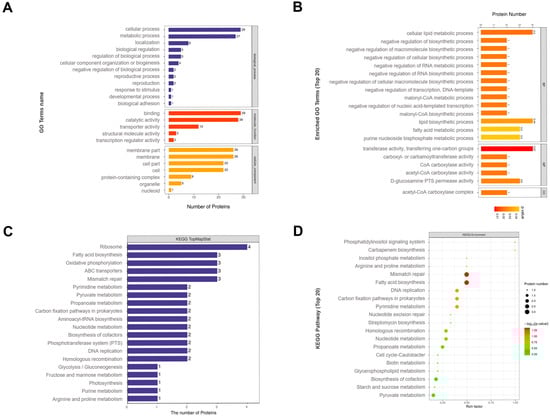 According to GO functional analysis (Figure 4B), the differential proteins in pH 9.0 E. faecalis MVs exhibit negative regulation of cellular lipid metabolic process and polymer biosynthesis process (macromolecule biosynthetic process), negative control of RNA biosynthesis, negative regulation of transcription, DNA template activity (DNA-templated), malonyl CoA biosynthetic process, and other important biological processes. They also possess molecular functions such as transferase activity for transferring one-carbon groups, acetyl-CoA carboxylase activity, CoA carboxylase activity, carboxyl or carbamoyl transferase activity, and D-glucosamine phosphatase transfer system (PTS) permease activity. Furthermore, the differential proteins in pH 9.0 E. faecalis MVs also have a localization function like that of the acetyl-CoA carboxylase complex.