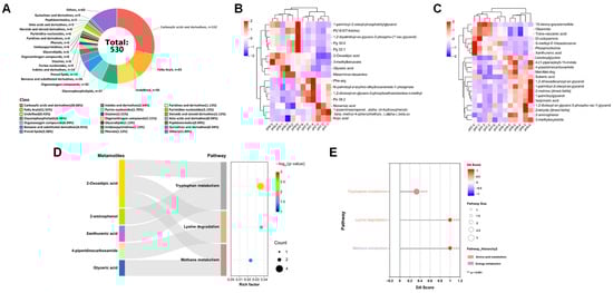 (A) The quantification and proportional distribution of metabolites in E. faecalis MVs identified under the conditions of pH 7.0 and pH 9.0 across various chemical classification categories were analyzed. Metabolites lacking an identifiable chemical classification were categorized as “undefined”. Meanwhile, those chemical classification subsets harboring fewer than 10 metabolites were pooled and collectively denoted as “others”. (B,C) Heatmap of cluster analysis for DEMs of E. faecalis MVs in negative ion mode (B) and positive ion mode (C) under pH 9.0 conditions. In the graphical representation, each column is congruent to a particular group of samples, and every row symbolizes a single metabolite. Notably, within the context of the heatmap, the red hue is indicative of metabolites that have undergone significant up-regulation, whereas the blue shade denotes those metabolites with pronounced down-regulation. (D) Sankey bubble diagram of KEGG enrichment pathways for DEMs in E. faecalis MVs under pH 9.0 condition. The sankey diagram positioned on the left illustrates the specific enrichment pathways to which the DEMs pertain. Meanwhile, the bubble diagram situated on the right exhibits the Rich ratio (plotted on the X-axis), enrichment items (displayed on the Y-axis), the quantity of metabolites (indicated by the bubble size), and the p-value (depicted by the color). (E) Lollipop chart of KEGG enrichment pathways for DEMs in E. faecalis MVs under pH 9.0 condition. The Y-axis denotes the names of the pathways, while the X-axis signifies the differential abundance score (DA score). The DA score represents the comprehensive total variation of all metabolites within the pathway. When the score exceeds 0, it implies that the expression trends of all the identified metabolites in this pathway are up-regulated. Conversely, when the score is below 0, it indicates that the expression trends of all the identified metabolites in this pathway are down-regulated. The length of each line segment corresponds to the absolute value of the DA score. The size of the dot at the terminal end of the line segment reflects the quantity of metabolites in the pathway. Moreover, the darkness of the dot’s color is directly proportional to the magnitude of the DA score value. *** p < 0.001.