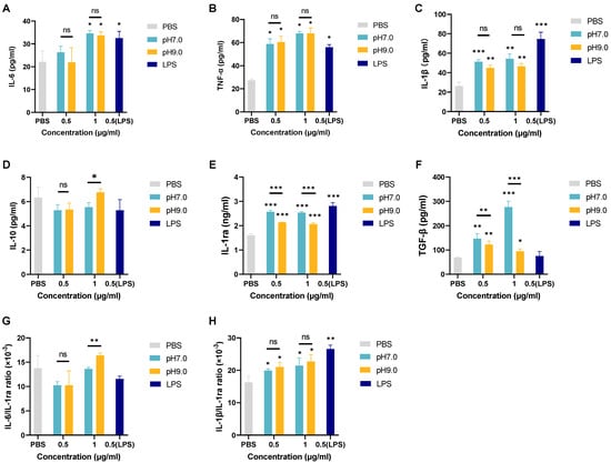 Effects of E. faecalis MVs on the secretion of IL-6 (A), TNF-α (B), IL-1β (C), IL-10 (D), IL-1ra (E), TGF-β (F), IL-6/IL-1ra ratio (G), and IL-1β/IL-1ra ratio (H) by dTHP-1 cells under different pH conditions. n = 3. The experiment was repeated three times; * p < 0.05, ** p < 0.01, *** p < 0.001, ns: non-significant.
