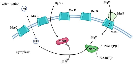 Research has identified a predominance of mercury resistance at the molecular level in bacteria [143]. The mer operon is the most extensively studied mechanism responsible for mercury inactivation in bacteria. It originally evolved in geothermal bacteria. Recent studies have indicated the presence of the operon in a variety of bacterial samples, including those derived from aerobic, anaerobic, aquatic, and soil environments [144]. The merB operon gene plays a pivotal role in the conversion, transport, and detoxification of highly toxic organic compounds like Hg. merA, in conjunction with a set of genes encoding membrane transporters, which are typically closely related in the operon, contributes to the deactivation of inorganic compounds [145]. Central to the mer operon is the merA gene, which encodes a flavin-dependent NAD(P)-disulfide oxidoreductase (MerA). This enzyme catalyses the conversion of Hg2+ to Hg0, with the resulting product subsequently diffusing out of the cell [146,147]. The current process is distinct from the majority of other HM detoxification systems in bacteria, which primarily utilise ATPase-based transport systems to facilitate the movement of metal ions across cell membranes or to sequester toxic ions in extracellular structures [148].
