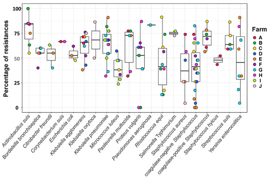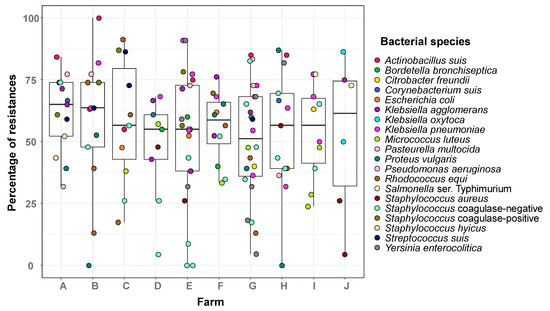 Percentage of antimicrobial resistance per farm. Nasal isolates from sows from ten farms were tested for antimicrobial susceptibility. The results are presented as box-plots, with a horizontal line indicating the median value and the box representing the middle 50% of the observed values. The results are organized by farm and presented in percentage of resistance (the number of tests giving a resistance result with respect to the total number of tests in each bacterial species). The bacterial species are represented with different colors following the legend on the right of the graph. Raw data can be found in Tables S1 and S3.