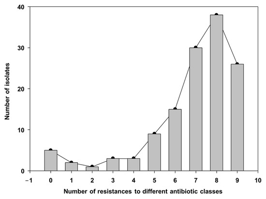 Distribution of number of resistances, including MDR (multi-drug resistance), in the bacterial isolates from the nasal cavities of sows obtained in this study.