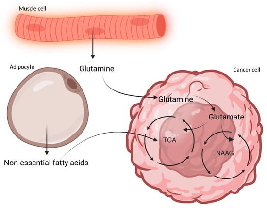 Cancer cachexia is a multifactorial syndrome in patients with a malignancy and characterized by unintentional weight loss, skeletal muscle loss (with or without loss of adipose tissue mass), and systemic inflammation [1,2]. About 3/4 of pancreatic and gastric cancer patients in advanced-stage are affected by cachexia and it has been shown to contribute to 1/5 to 1/3 of cancer-related deaths [3,4]. Cachexia leads to progressive functional impairment and poor tolerance to anticancer treatments, which leads to diminished quality of life and, thereby, reduced survival [5,6,7]. It has also been linked to gut barrier dysfunction, impaired insulin sensitivity and food intake dysregulation [1,2], along with multi-organ wasting including liver, brain, bone, and heart [8]. Cachexia has thus been described as a metabolic disorder marked by tissue wasting, overall catabolic state, and anabolic signal resistance which releases nutrients in the blood stream, feeding energy-demanding highly proliferative cancer cells [1,9,10]. Figure 1 illustrates that muscle and adipose cell wastage provides glutamine and non-essential fatty acids that feed cancer cells via the Krebs cycle (tricarboxylic acid cycle) [1,11].