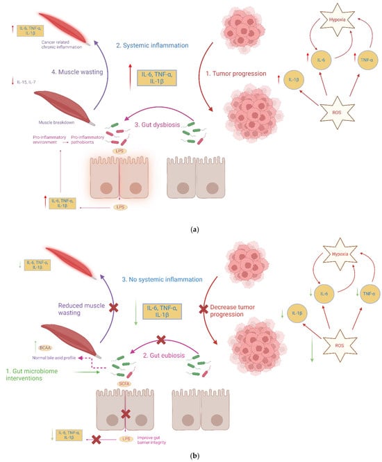 Another factor connecting gut microbes to cachexia is gut barrier integrity. The intestinal mucosal barrier normally prevents the translocation of bacteria and endotoxins (such as lipopolysaccharide, LPS) into circulation. Dysbiosis can undermine this barrier by reducing levels of butyrate-producers (which support the epithelial barrier) and by enriching pathobionts that trigger mucosal inflammation [40]. In a mouse model of cancer cachexia (ApcMin/+ colorectal cancer model), increased intestinal permeability was observed with cachexia onset; this leakiness was associated with elevated circulating LPS and interleukin (IL)-6 and marked activation of inflammatory pathways [41]. Similarly, cachectic mice bearing colon tumors showed higher expression of gut epithelial claudins (indicating disrupted tight junction regulation) and evidence of bacterial translocation with elevated serum LPS-binding protein (LBP) [26]. Translocated gut microbial products can stimulate Toll-like receptors and immune cells systemically, fueling a chronic inflammatory state that promotes muscle proteolysis and metabolic derangements [42]. Human studies mirror these findings: cachectic patients with gastrointestinal cancers exhibited increased intestinal permeability and tight junction abnormalities [43]. The same study also showed that cachexia-positive patients had a higher endotoxin load and inflammatory cytokines (IL-6, TNF-α, IFN-γ) compared to non-cachectic patients [43]. This paints a picture wherein tumor-driven inflammation and gut microbiota changes work together to damage the gut barrier, leading to endotoxemia that further induces systemic inflammation. Figure 2a shows the vicious cycle of systemic inflammation that underlies cancer cachexia pathogenesis.