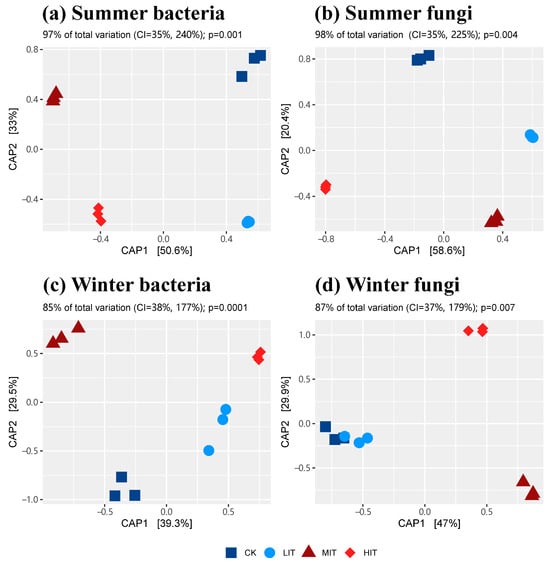 - Žifčáková, L.; Větrovský, T.; Lombard, V.; Henrissat, B.; Howe, A.; Baldrian, P. Feed in summer, rest in winter: Microbial carbon utilization in forest topsoil. Microbiome 2017, 5, 122. [Google Scholar] [CrossRef]