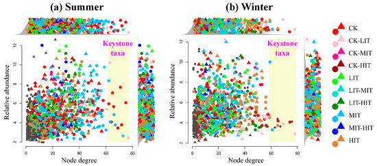 | Season | Number of Nodes | Number of Edges | Average Connectivity | Number of tsOTUs | Number of Keystones OTUs | |||||
