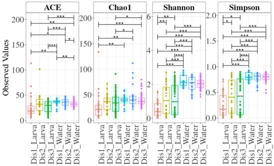 Species richness and diversity indices for larval and water samples based on the disinfection method. Boxes represent the interquartile range, the line within the boxes is the median, and the dots represent samples. Lines with asterisks above the boxes denote significant differences between compared pairs of samples. Asterisks denote different p-value ranges (***: p ≤ 0.001; **: 0.001 < p ≤ 0.01; *: 0.01 < p ≤ 0.05).