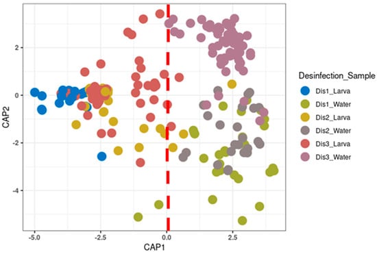 Canonical analysis of principal coordinates (CAP) of beta-diversity based on GUnifrac distance between each type of disinfection at different components of the larviculture (p-value: 0.001).