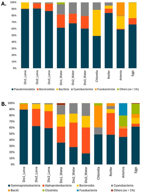 The microbial composition associated with the three different types of disinfection, Dis1, Dis2, and Dis3, in S. aurata larvae, rearing water, feed, and eggs (A) at the phylum level, and (B) class level.