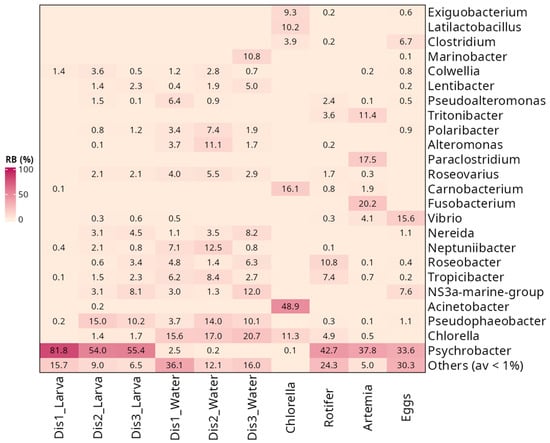 The bacterial community of larval samples was characterized mainly by the presence of four phyla: Pseudomonadota, Bacillota, Bacteroidota, and Cyanobacteriota (Figure 3A). Pseudomonadota was the dominant phylum in larvae, representing 90% of the bacterial community. In larvae from Dis1 tanks, the most abundant OTUs belonged to Gammaproteobacteria (89.4 ± 2.3%), followed by Bacilli (8.2 ± 2.2%) (Figure 3B). Larvae reared in Dis2 and Dis3 tanks shared similar bacterial communities, characterized by a decrease in Gammaproteobacteria (62.6 ± 4.5%, and 59.2% ± 5.0%, respectively) and an increase in Alphaproteobacteria (28.1 ± 3.7%, and 27.6 ± 3.5%, respectively) and Bacteroidia (7.9 ± 1.6%, and 11.2 ± 2.1%, respectively) (Figure 3B). At the genus level, larvae reared in Dis1 tanks showed a dominance of Psychrobacter (81.8 ± 2.8%) (Figure 4). For Dis2 and Dis3 tanks, larvae showed a lower abundance of Psychrobacter compared to those in Dis1 tanks (54.0 ± 5.3% and 55.4 ± 5.3%, respectively), followed by Pseudophaeobacter (15.0 ± 2.3% and 10.2 ± 1.7%, respectively). The relative abundance of each of the remaining genera was less than 10% (Figure 4, Table S1).
