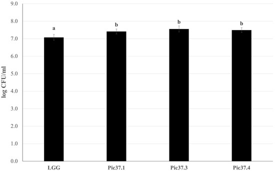 To further evaluate the ability of the three LAB strains to reach the intestine in a viable form, their resistance to gastrointestinal stress factors was assessed through a simulated in vitro digestion assay. The survival rates of all strains were higher as compared to that of the reference strain LGG, whose survival rate was consistent with previous findings [41]. Overall, the results obtained suggest an excellent capacity of the three tested strains to tolerate adverse conditions of the gastrointestinal tract. In particular, L. plantarum Pic37.4 showed the highest survival capacity.